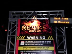 7) The Orfanage: Ashes to Ashes- Our first house of the night came in the form of this one. It was very cool getting to see Cindy get some proper treatment in the form of her own house. I will tell you that there are only a few scenes that will really knock your socks of, but the presence of this house is what gets you. The realistically give you the feeling of trying to escape a burning building all the while being haunted by the ever sadistic Cindy Cain! The story you get the feel for is that some how The Caretakers daughter didn’t die all those years ago. More she was sent to an Orphanage, and things didn’t go well. There is a very cool scene toward the beginning where you see little Cindy writing “Do on to others…” on a chalk board. As you pass there is a black light effect that makes words look like they are bleeding. The other scenes involve other children trapped in beds, or in cages while they slowly roast. It is also noteworthy that in these scenes if you’re not careful you will get a surprise from our little demented orphan! The final scene you walk through gives you a pretty “heated” experience, as you are exposed to some real flame to give you one last jump! The house is definitely a good starter if you want to heat things up…you know light your fire….help you feel the burn…OK I’ll stop!